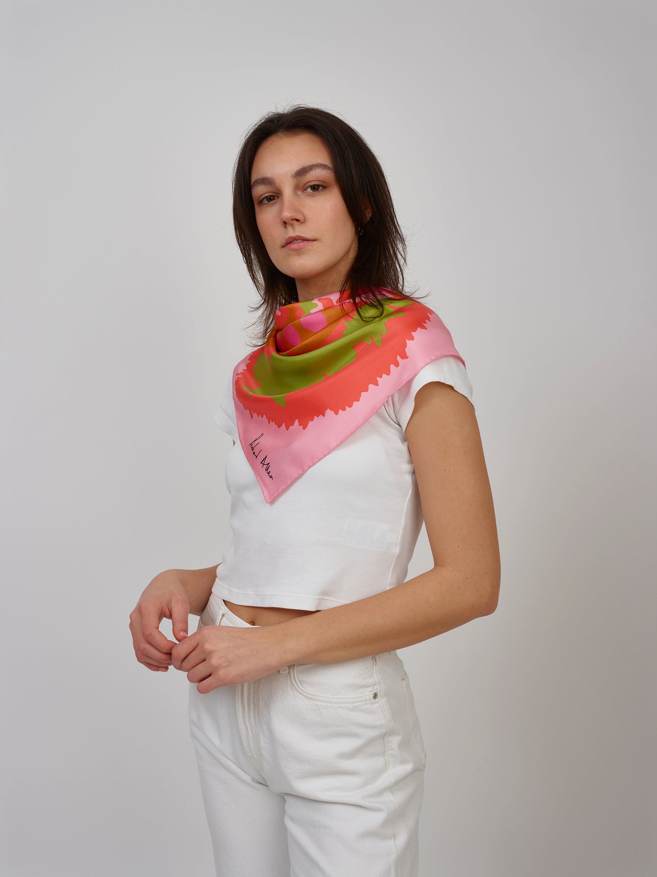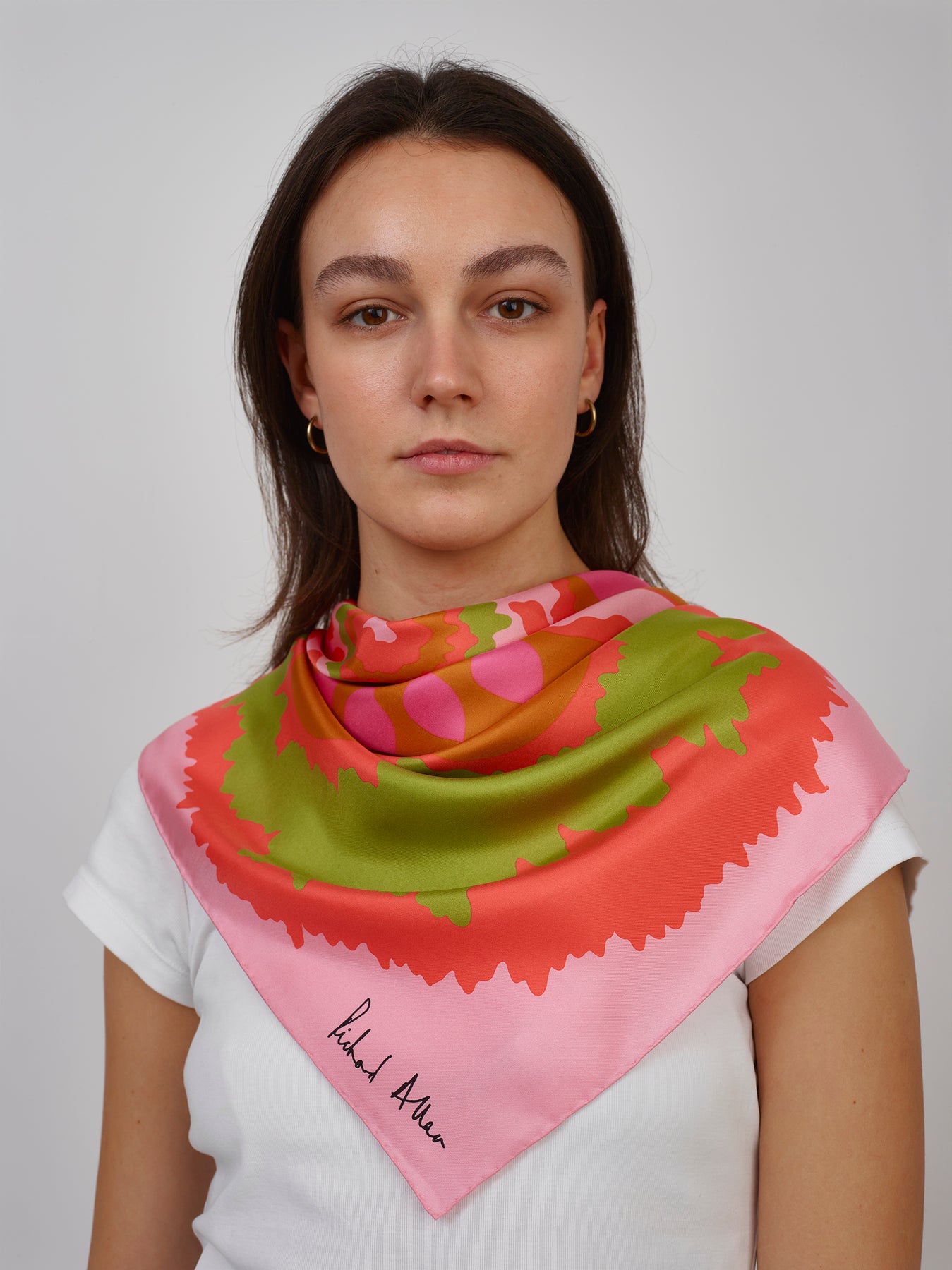 A joyful salute to striking individuality, paying tribute to Elsa Schiaparelli ~ the iconic designer with whom Richard Allan collaborated ~ our Elsa Silk Square Scarf celebrates artistic flair and vibrant style. Rendered in rich brown and red jewel tones, it brings a striking pop of colour to elevate any daytime or evening look.