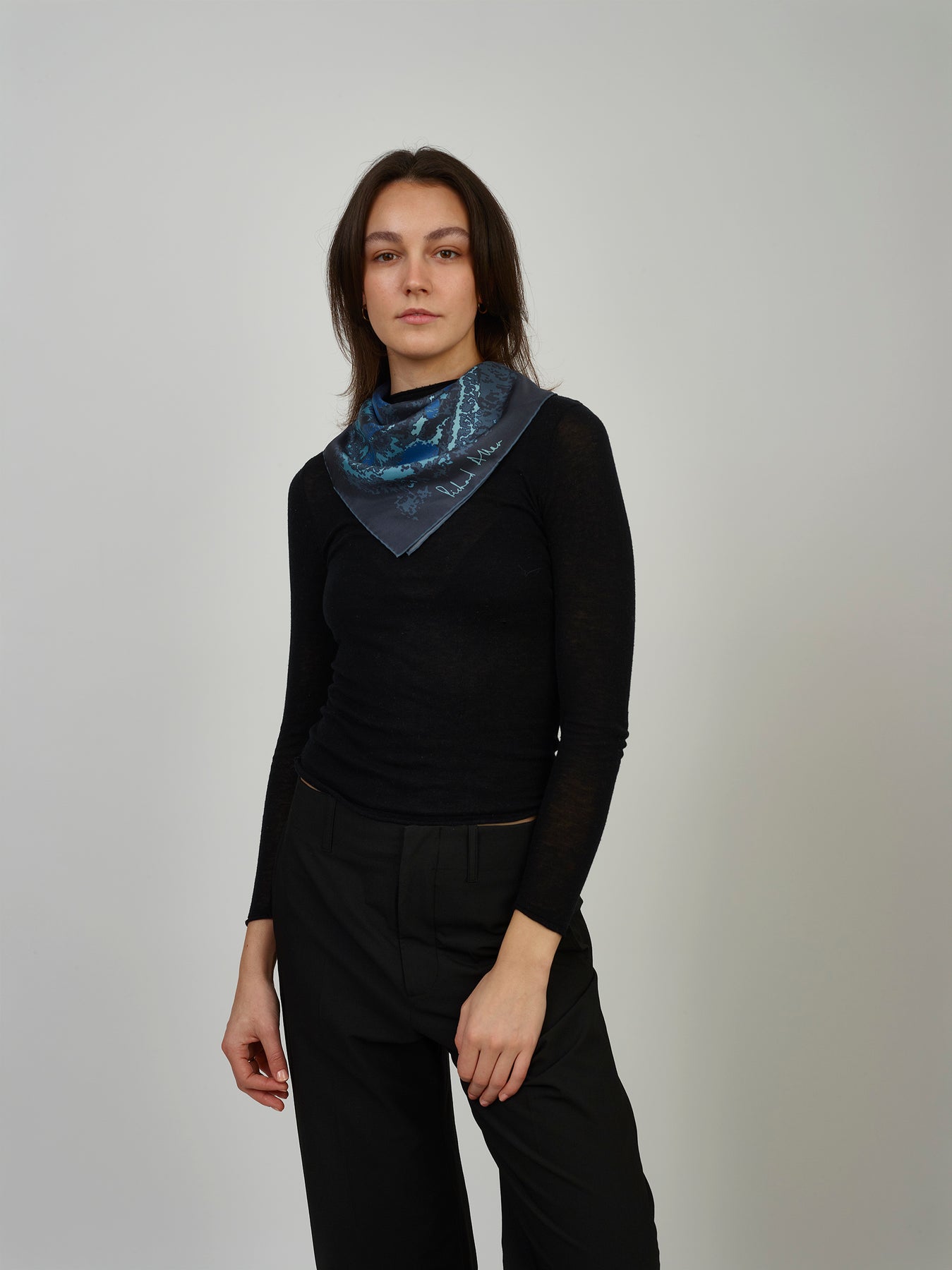 Elevate your style with this multi-dimensional silk scarf from our archive. Featuring a pixelated paisley pattern, in vintage navy and light blues, intertwined with hidden flowers, shells, and geological textures, the design unfolds like a modern mosaic—layered, rhythmic, and effortlessly elegant. Its modular composition brings vibrant contrast and fluid harmony, making it a versatile statement piece for any wardrobe.