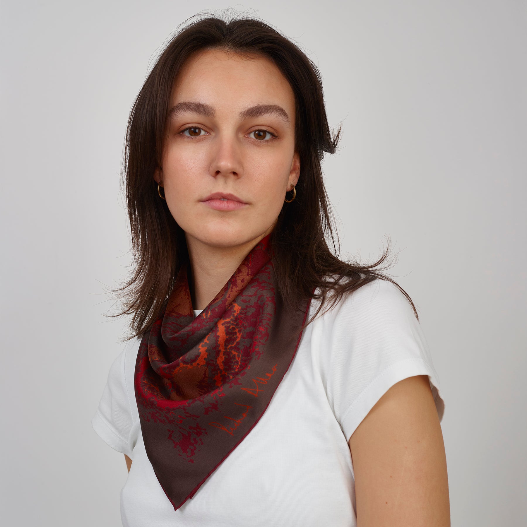 Elevate your style with this multi-dimensional silk scarf from our archive. Featuring a pixelated paisley pattern, in red and chocolate brown, intertwined with hidden flowers, shells, and geological textures, the design unfolds like a modern mosaic—layered, rhythmic, and effortlessly elegant. Its modular composition brings vibrant contrast and fluid harmony, making it a versatile statement piece for any wardrobe.