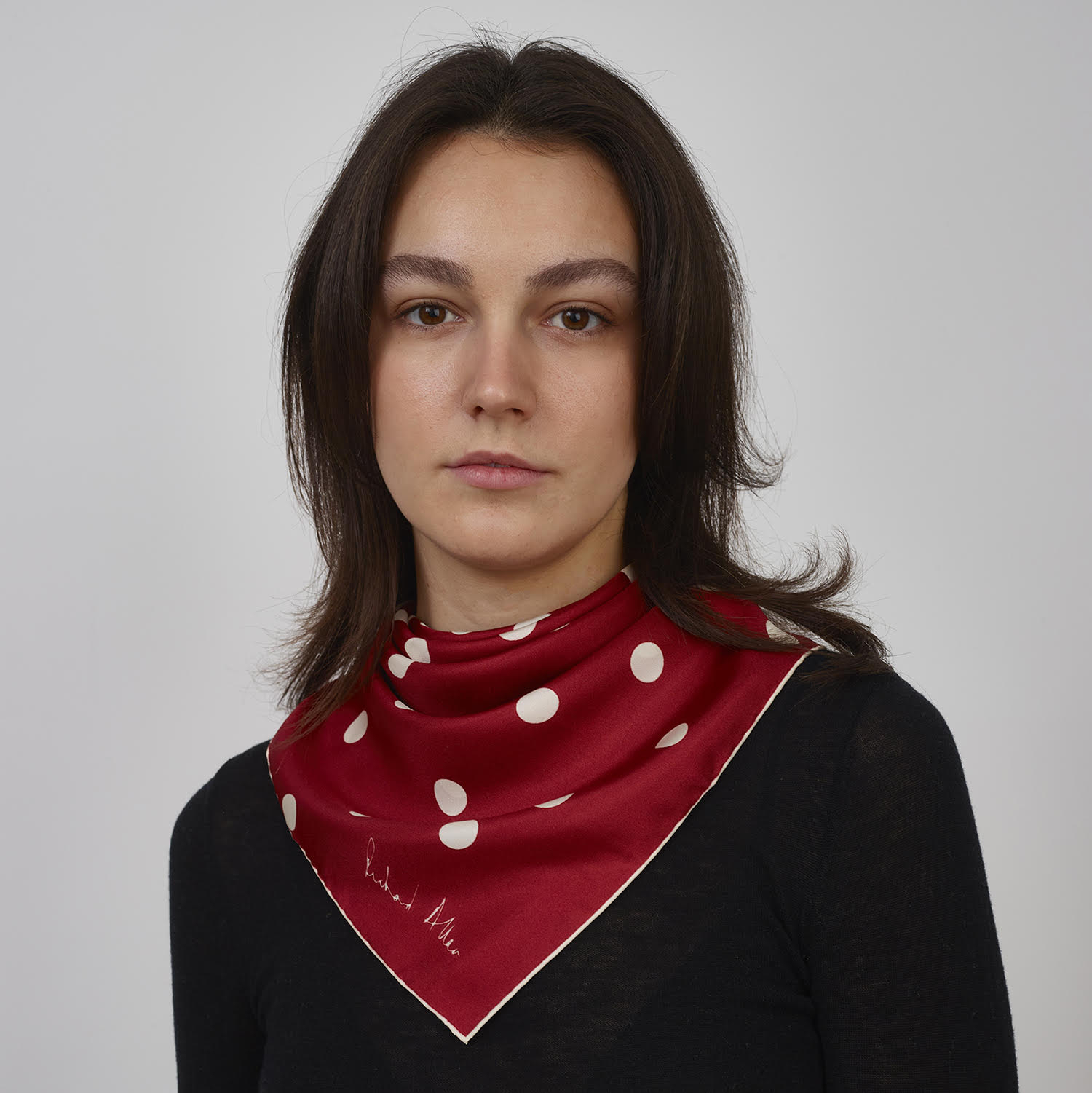 This beautiful little silk scarf in festive red is the perfect accessory for dressing up or down ~ daytime, jeans, workwear, evening and this polka dot has the edge; choose more or less dots in your fold...!